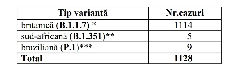 Din cele 1.128 cazuri, la trei dintre ele - unul de infectare cu tulpina britanică, unul cu tulpina sud-africană și unul cu tulpina braziliană - a fost descoperită mutația E484K. Cele trei cazuri sunt în Suceava, București și Ilfov.