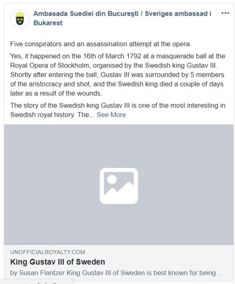 „Cinci conspiratori şi o tentativă de asasinare la operă. Da, s-a întâmplat pe 16 martie 1792 la un bal mascat organizat la Opera Regală din Stockholm de către regele suedez Gustav al III-lea. La scurt timp după ce şi-a făcut apariţia la eveniment, regele suedez a fost înconjurat de cinci membri ai aristocraţiei şi împuşcat. Gustav al III-lea a murit câteva zile mai târziu, din cauza rănilor provocate”, a fost mesajul postat pe pagina de Facebook a Ambasadei Suediei la București.