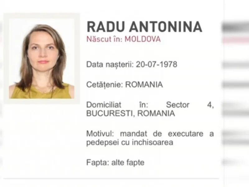 Antonina Radu, pompier, condamnată în dosarul Colectiv la 8 ani și 8 luni, a fost dată în urmărire națională, fiind emis mandat de arestare european, informează Poliția Capitalei.