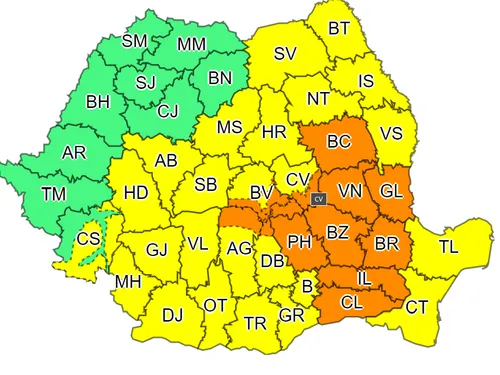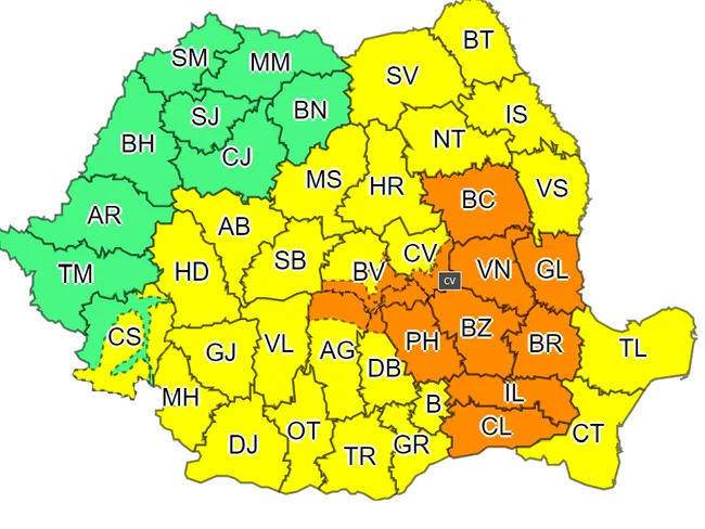 Potrivit codului portocaliu, în județele Bacău, Galați, Vrancea, Brăila, Ialomița, Călărași, Buzău, Prahova și în zona de munte a județelor Dâmbovița, Argeș, Brașov și Covasna va ploua abundent și se vor acumula cantități de apă de 40...50 l/mp și izolat 60...80 l/mp.