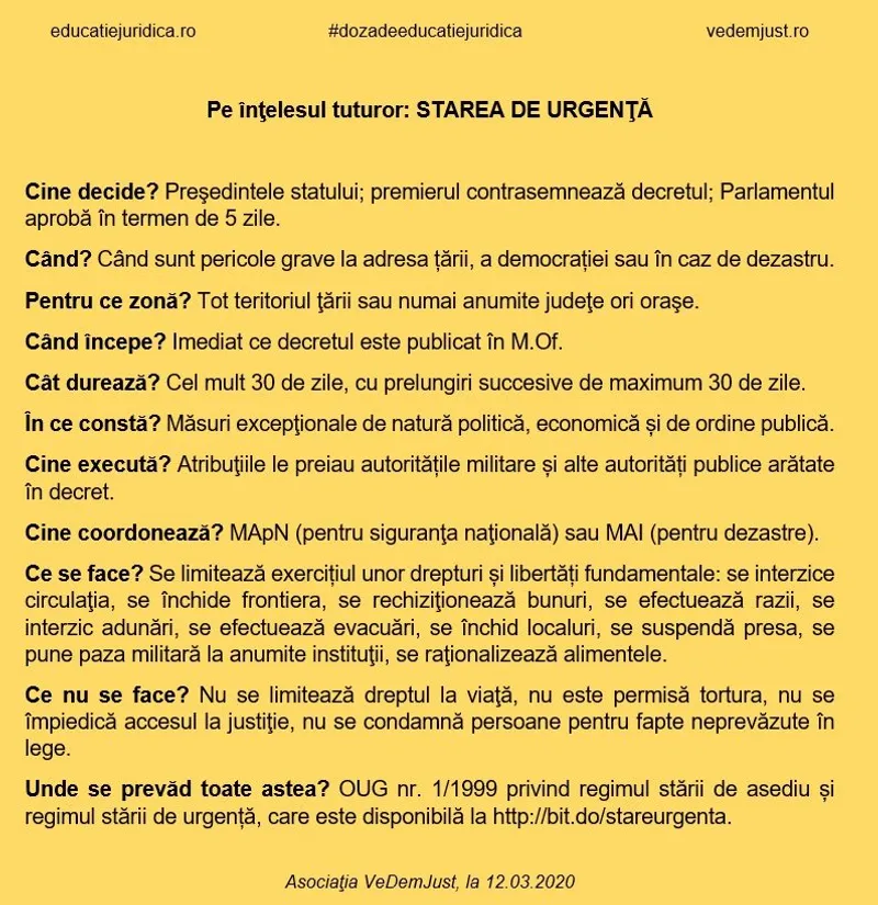 „Pe durata stării de asediu și a stării de urgență, proporțional cu gravitatea situației ce a determinat instituirea acestora și numai dacă este necesar, poate fi restrâns exercițiul unor drepturi sau libertăți fundamentale înscrise în Constituție, cu acordul ministrului justiției”, spune OUG menționată anterior.