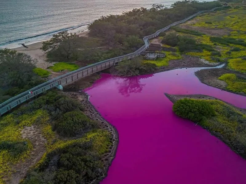 Apa unui lac din Kealia Pond National Wildlife Refuge, unul dintre puținele mlaștini cu apă sărată de coastă de pe insula Maui, este de un roz strălucitor, din 30 octombrie.