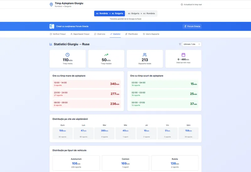 Pleci cu mașina în vacanță în Bulgaria, Grecia, Turcia? A fost inventată o aplicație live pentru coșmarul de pe Podul Giurgiu-Ruse, unde, în weekend, s-a stat și 7 ore la coadă. Prezintă timpii de așteptare în timp aproape real, precum și statistici pe zile și ore.