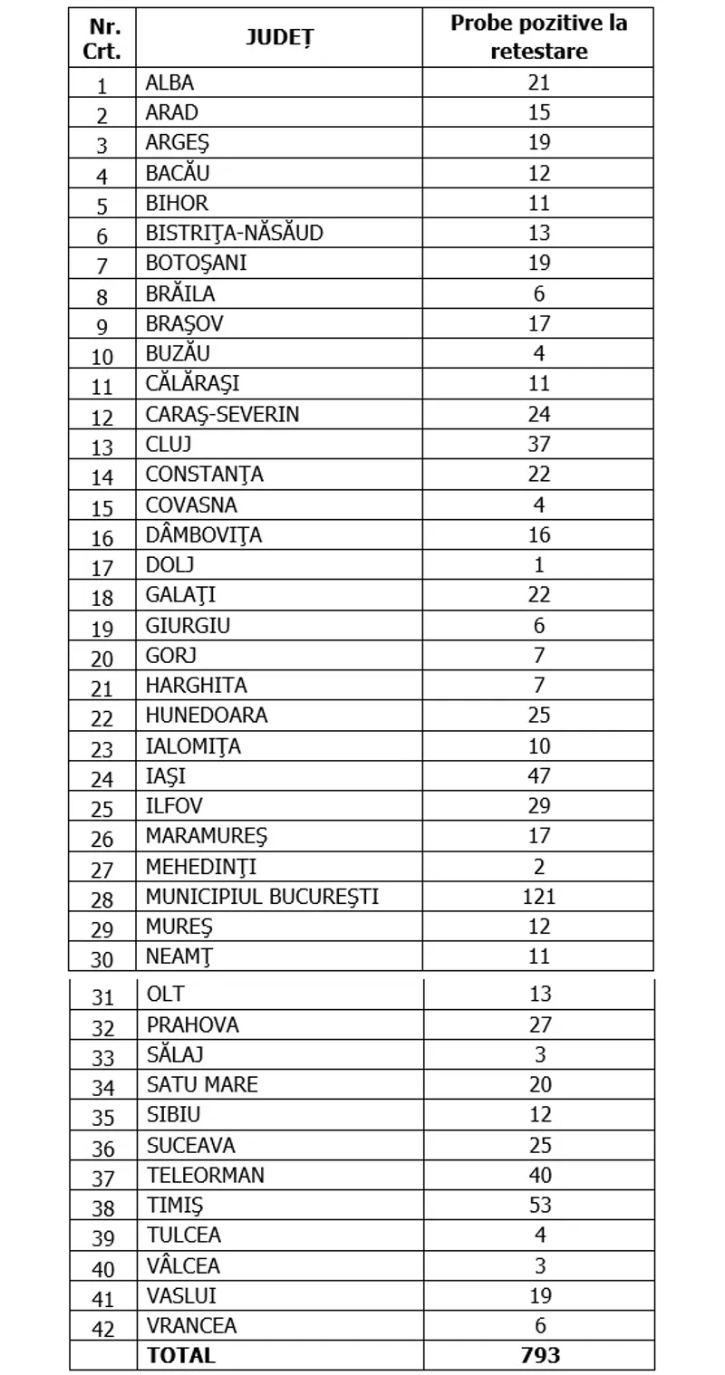 Distinct de cazurile nou confirmate, în urma retestării pacienților care erau deja pozitivi, 793 de persoane au fost reconfirmate pozitiv.