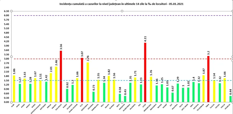 Coeficientul infectărilor cumulate la 14 zile, raportate la 1.000 de locuitori este calculat de către Direcțiile de Sănătate Publică, la nivelul Municipiului București și al județelor. Mai jos aveți graficul realizat în baza raportărilor primite de CNCCI de la Direcțiile de Sănătate Publică: