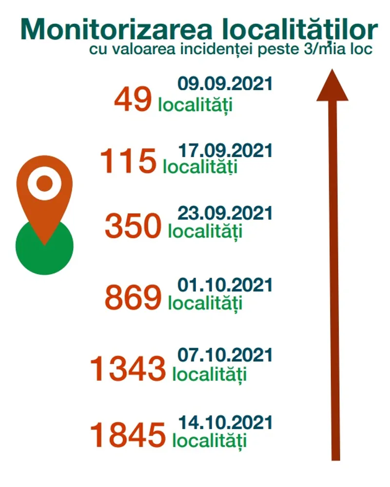 În 1 octombrie, 869 de localități raportau o incidență mai mare de 3 la mie, iar în 14 octombrie 1.845 de localități erau în scenariul roșu, de peste două ori mai multe.