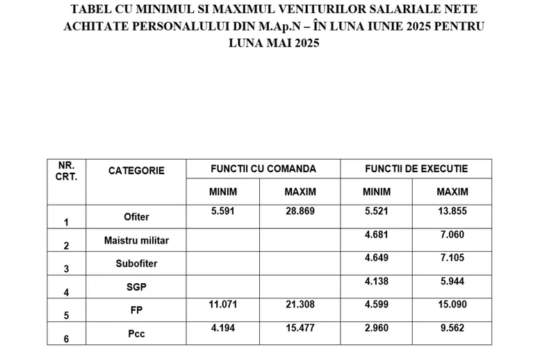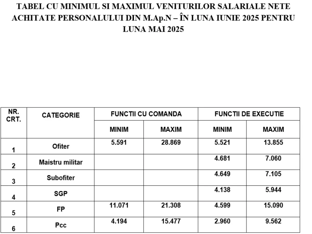 Salariale nete achitate personalului din Ministerul Apărării Naționale - în luna iunie 2025 pentru luna mai 2025