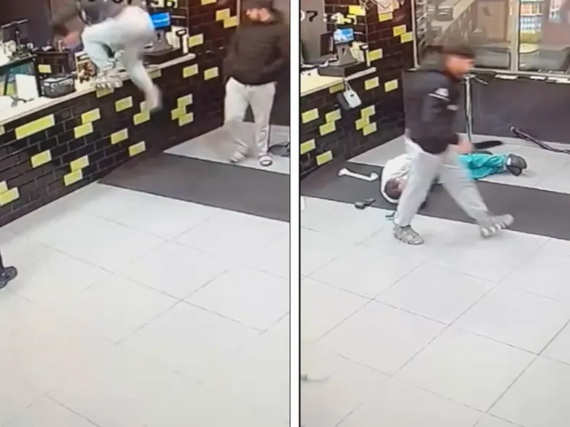 "I-a împins, i-a îmbrâncit, i-a lovit efectiv cu acea macetă, le-a spart capul. Pe unul dintre ei l-a aruncat peste tejghea, l-a lovit cu capul de pâmânt, omul a rămas două minute nemişcat", spune managerul shaormeriei.