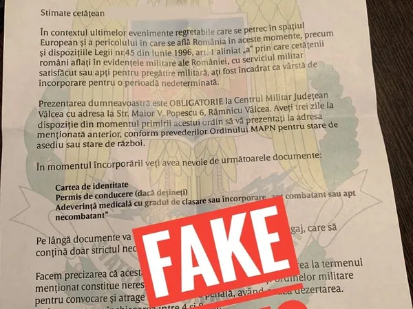 Documentul din imagine, fals de la un capăt la altul, se pretinde a fi un așa-zis "ordin de încorporare" emis de Centrul Militar Județean și distribuit în județul Vâlcea.