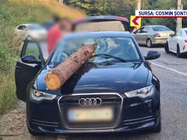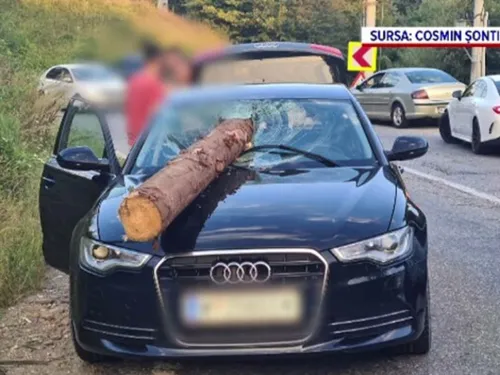 Un buștean căzut din remorcă a intrat prin parbrizul unei mașini care venea din spate și a trecut milimetric printre șoferul autoturismului și soția acestuia, aflată pe locul din dreapta.
