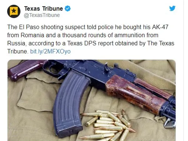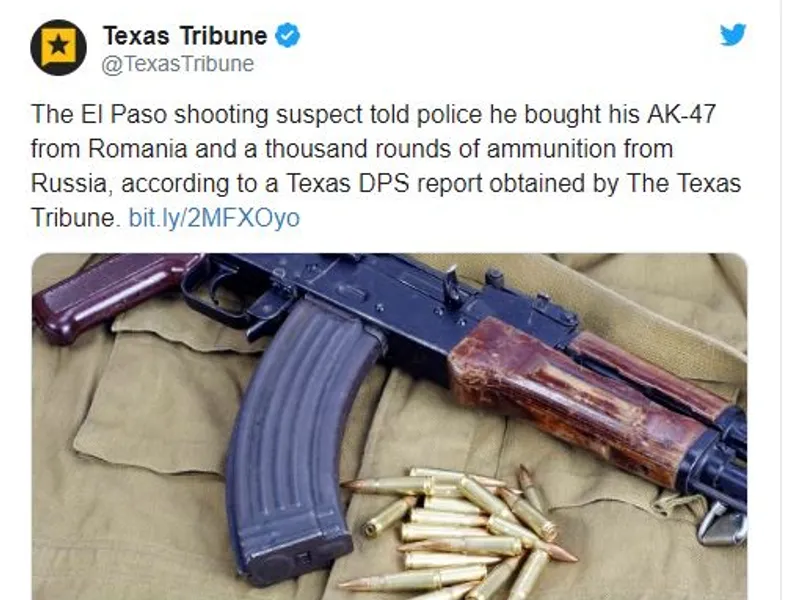 Autorul masacrului din El Paso, Texas, în care au fost ucise 22 de persoane, a declarat poliţiei că puşca AK pe care a folosit-o în atac provenea din România, iar muniția din Rusia, informează The Texas Tribune.
