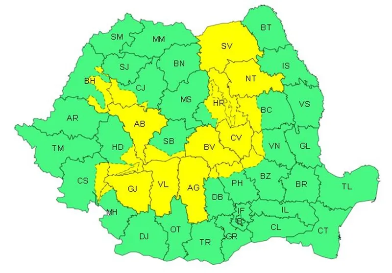 Se vor afla sub Cod galben judeţele Suceava, Neamţ, Covasna, Braşov, Argeş, Vâlcea, Gorj, şi Alba, integral, şi, parţial, Harghita, Bacău, Vrancea, Buzău, Prahova, Dâmboviţa, Sibiu, Mehedinţi, Caraş-Severin, Hunedoara, Bihor şi Cluj.