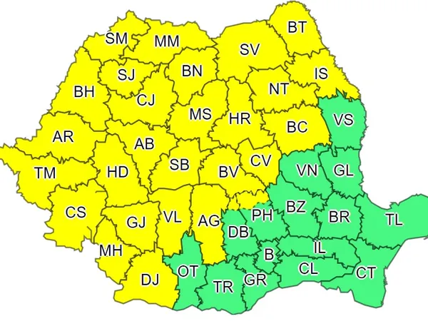 27 de județe sunt sub cod galben de instabilitate atmosferică, până marți seară, avertizează Administrația Națională de Meteorologie (ANM)