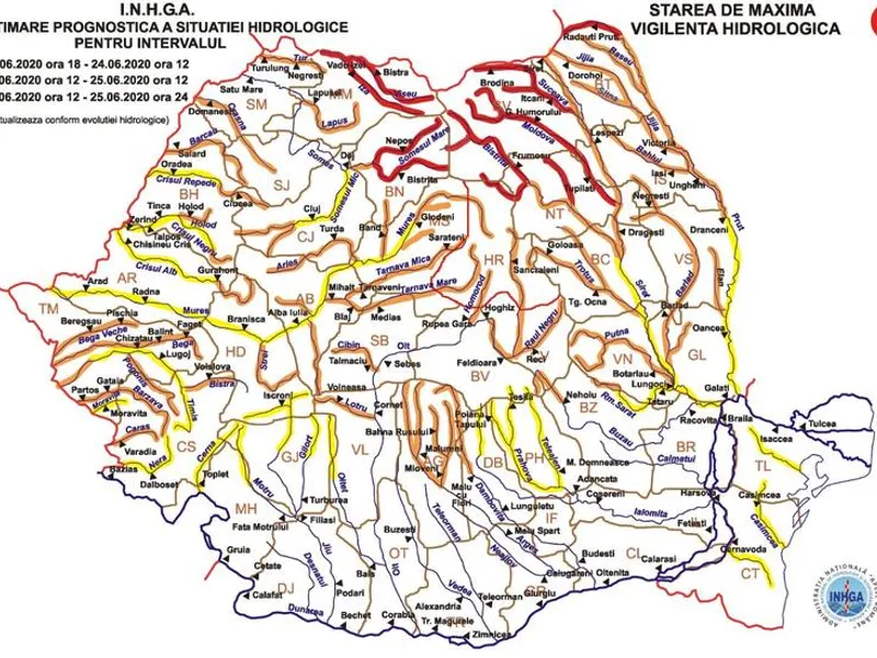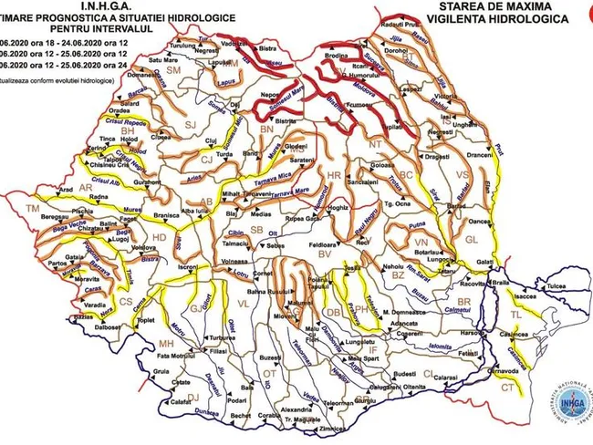 COD PORTOCALIU:În intervalul 22.06.2020 ora 12:00 – 25.06.2020 ora 12:00 pe râurile din bazinele hidrografice: Tisa - sector aval intrarea ȋn ţară, Vişeu, Iza, Tur (judeţele: Maramureş şi Satu Mare), Someşul Mare (judeţul Bistriţa Năsăud), Lăpuş (judeţul Maramureş), Someşul Mic – bazin superior şi afluenţi bazin mijlociu şi inferior (judeţele: Cluj şi Bihor), Someş – afluenţii mici aferenţi sectorului aval S.H. Dej (judeţele: Cluj, Sălaj, Maramureş şi Satu Mare), Crasna (judeţele: Sălaj şi Satu Mare), Ier – bazin superior şi afluenţi bazin mijlociu (judeţele: Satu Mare şi Bihor), Barcău (judeţele: Sălaj şi Bihor), Crişul Repede – bazin superior şi afluenţi bazin mijlociu şi inferior (judeţele: Cluj şi Bihor), Crişul Negru - bazin superior şi afluenţi bazin mijlociu şi inferior (judeţele: Bihor şi Arad), Crişul Alb - bazin amonte S.H. Gurahonţ şi afluenţii aferenţi sectorului aval S.H. Gurahonţ (judeţele: Hunedoara şi Arad), Mureş – bazin superior amonte S.H. Glodeni şi afluenţii aferenţi sectorului aval S.H. Glodeni (judeţele: Mureş, Harghita, Bistriţa Năsăud, Cluj, Alba, Sibiu, Hunedoara şi Arad), Bega Veche, Bega (judeţul Timiş), Timiş - sector aval S.H. Şag, ca urmare a propagării viiturilor formate anterior ȋn amonte (sector ȋndiguit - judeţul Timiş), Timiş – afluenţii aferenţi sectorului aval S.H. Sadova, Bârzava, Caraş (judeţele: Timiş şi Caraş Severin), Olt – bazin superior amonte S.H. Hoghiz şi afluenţii aferenţi sectorului aval S.H. Hoghiz – amonte Ac. Ioneşti (judeţele: Harghita, Covasna, Braşov, Sibiu, Vâlcea şi Argeş), Argeş – bazin superior, Dâmboviţa – bazin superior (judeţele: Argeş şi Dâmboviţa), Siret – sector amonte Ac. Galbeni, Siret – afluenţii mici aferenţi sectorului aval confluenţă cu râul Suceava (judeţele: Suceava, Iaşi, Nemţ, Bacău, Vrancea şi Galaţi), Suceava (judeţul Suceava), Moldova (judeţele: Suceava şi Neamţ), Bistriţa (judeţele: Suceava, Neamţ, Harghita şi Bacău), Trotuş (judeţele: Harghita, Covasna, Neamţ şi Bacău), Putna (judeţul Vrancea), Rm. Sărat – bazin superior şi afluenţi bazin mijlociu şi inferior (judeţele: Buzău şi Vrancea), Buzău – bazin superior amonte S.H. Nehoiu şi afluenţi bazin mijlociu şi inferior (judeţele: Braşov, Covasna şi Buzău), Bârlad (judeţele: Neamţ, Iaşi, Vaslui, Bacău, Vrancea şi Galaţi), Başeu (judeţul Botoşani), Jijia (judeţele: Botoşani şi Iaşi), Prut – sector amonte Ac. Stânca Costeşti (judeţul Botoşani), Prut – afluenţii aferenţi sectorului aval S.H. Drânceni (judeţele: Vaslui şi Galaţi) şi Prut – sector aval Ac. Stânca Costeşti - amonte S.H. Drânceni - ca urmare a tranzitării ȋn regim controlat prin Ac Stânca Costeşti a viiturilor formate anterior ȋn amonte de intrarea ȋn ţară (judeţele: Botoşani, Iaşi şi Vaslui).