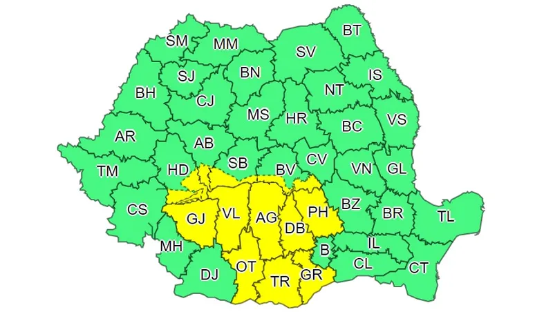 Judeţele pentru care s-a emis avertizarea de cod galben sunt: Alba, Argeş, Braşov, Dâmboviţa, Gorj, Giurgiu, Hunedoara, Olt, Prahova, Sibiu, Teleorman şi Vâlcea.