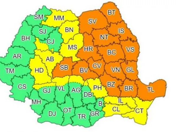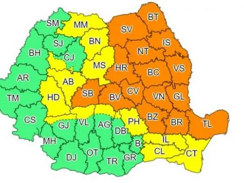 Codul portocaliu vizează Moldova, nord-estul Munteniei, nordul Dobrogei și în sudul și estul Transilvaniei, în total 15 județe.