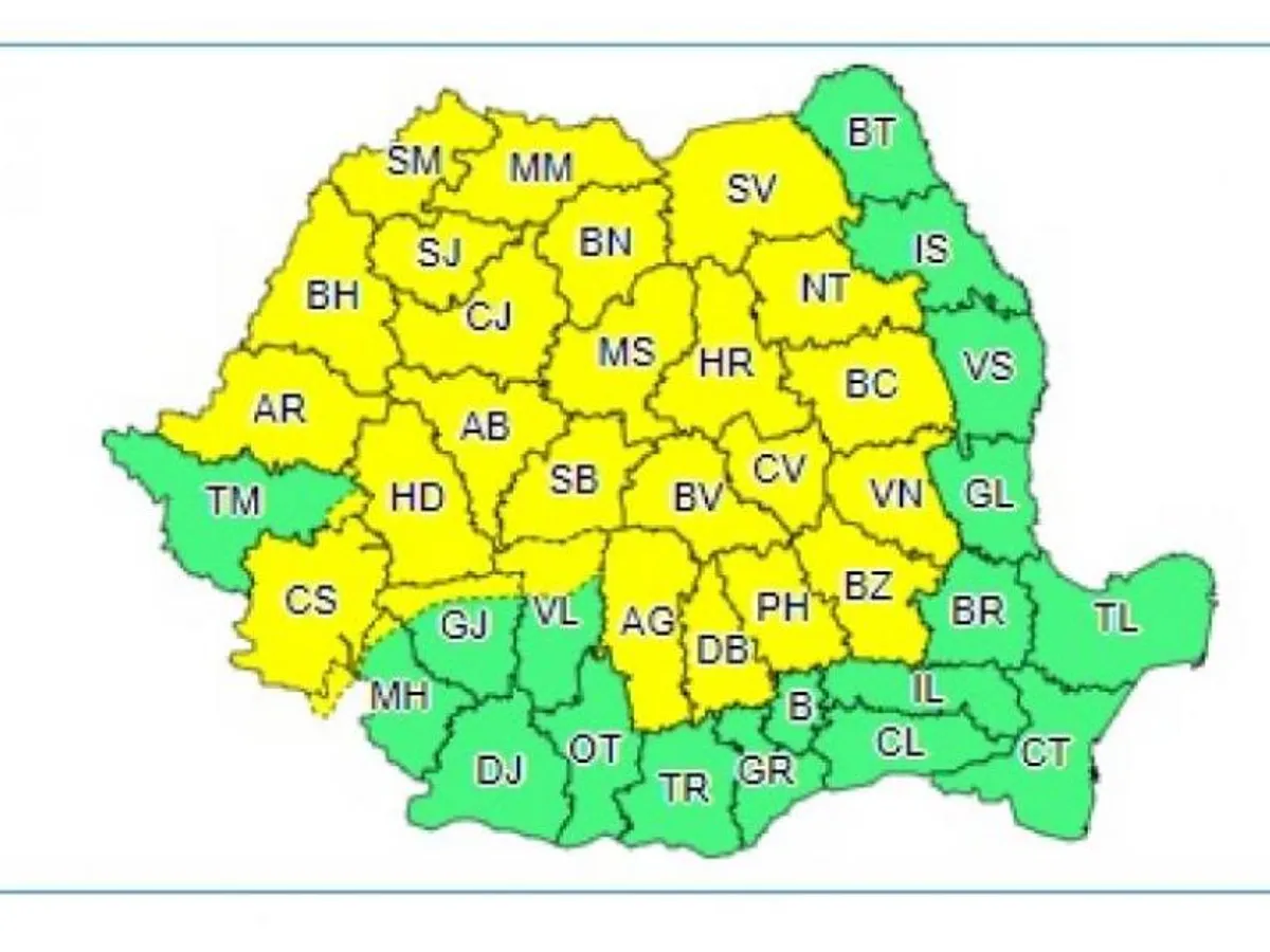 Atenționarea a intat în vigoare la ora 10.00 și este valabilă până la ora 23.00 și vizează instabilitate atmosferică temporar accentuată, cu ploi, vijelii, grindină, potrivit ANM.