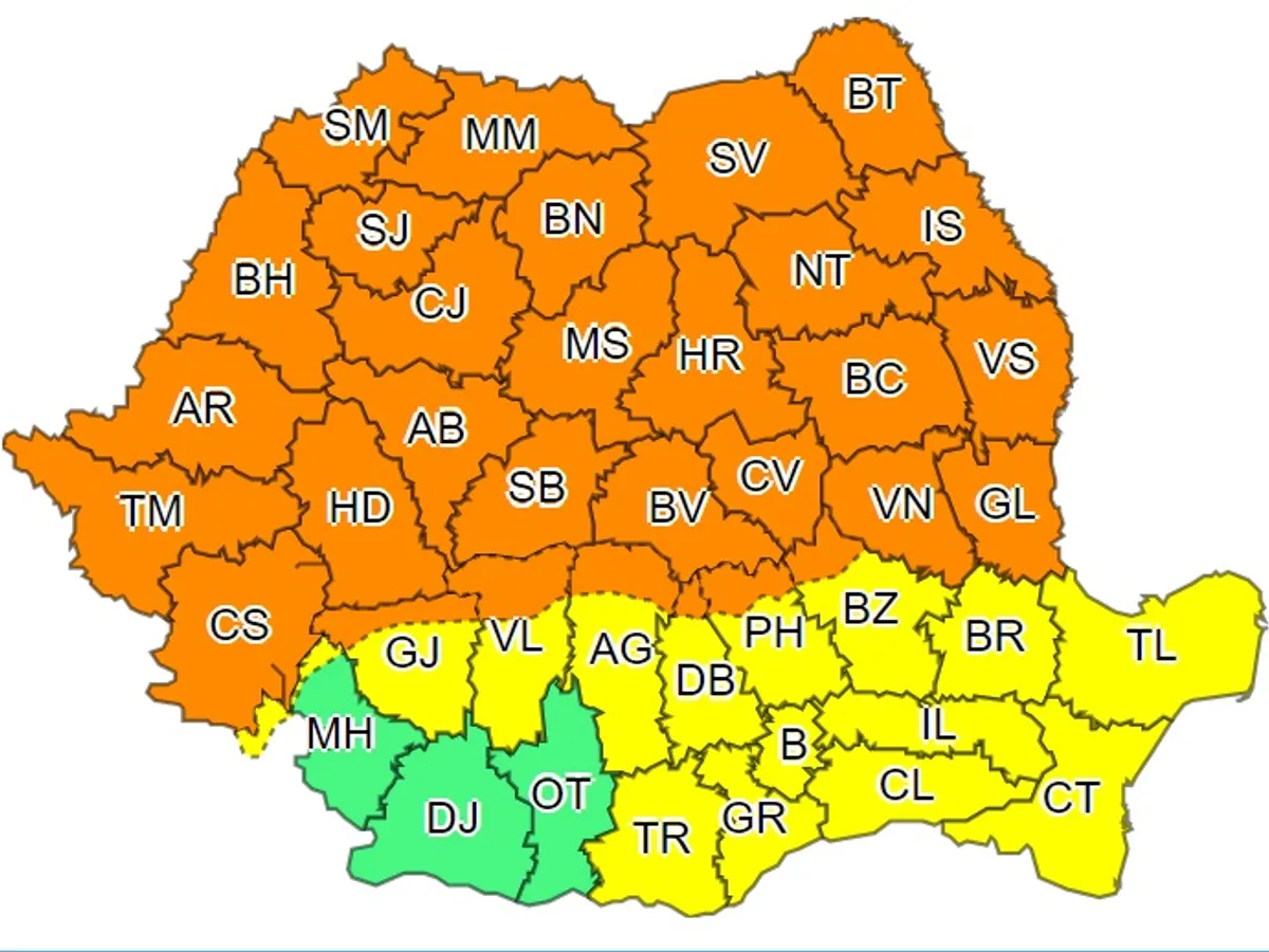 Administraţia Naţională de Meteorologie (ANM) a emis o avertizare Cod portocaliu, de luni de la ora 10.00, până marţi, la aceeaşi oră, vizând instabilitate atmosferică accentuată şi cantităţi de apă însemnate.