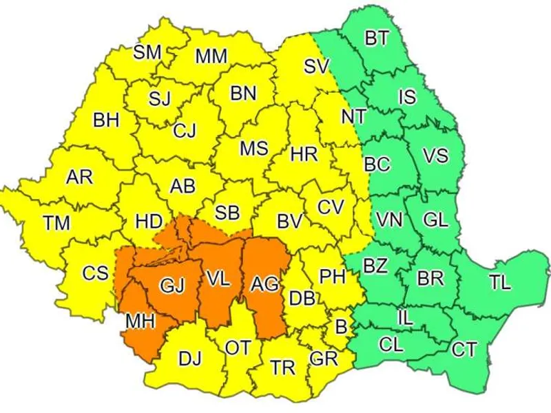 Codul galben de vreme instabilă este valabil pentru judeţele: Satu Mare, Maramureş, Sălaj, Bistriţa-Năsăud, Bihor, Cluj, Mureş, Harghita, Covasna, Arad, Timiş, Braşov, Dolj, Olt, Dâmboviţa, Prahova, Teleorman, Giurgiu şi municipiul Bucureşti, şi parţial în judeţele Caraş-Severin, Hunedoara, Alba şi Sibiu.
