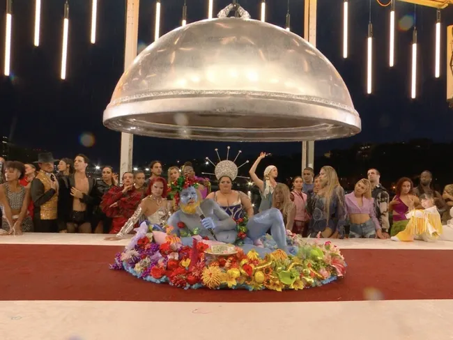 Dar poziția lui pare asemănătoare cu cea adoptată de „Dionysos/Bachus” din momentul de la ceremonia de deschidere a Olimpiadei, când personajul colorat în albastru apare stând pe masă, în chip de zeu al vinului și plăcerilor reunit cu participanții la „Cina cea de Taină”, varianta Thomas Jolly.