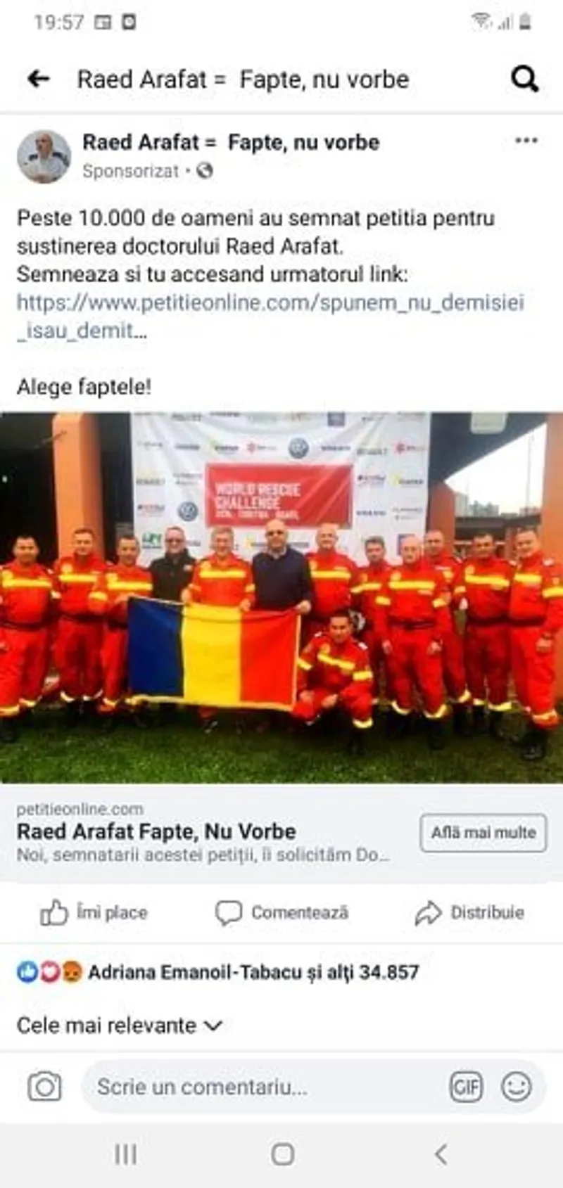 Există un indiciu că sumele plătite pentru ca această petiție să ajungă la cât mai multă lume nu sunt mici. În timp ce pagina are doar 3.400 de urmăritori, la postare au reacționat 34.000 de oameni. Pagina este un tribut adus lui Raed Arafat, fiind postate interviuri, declarații, poze cu el.