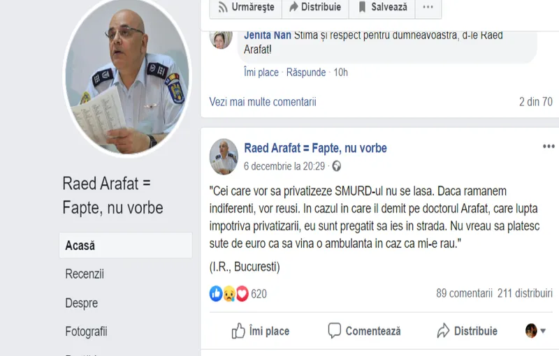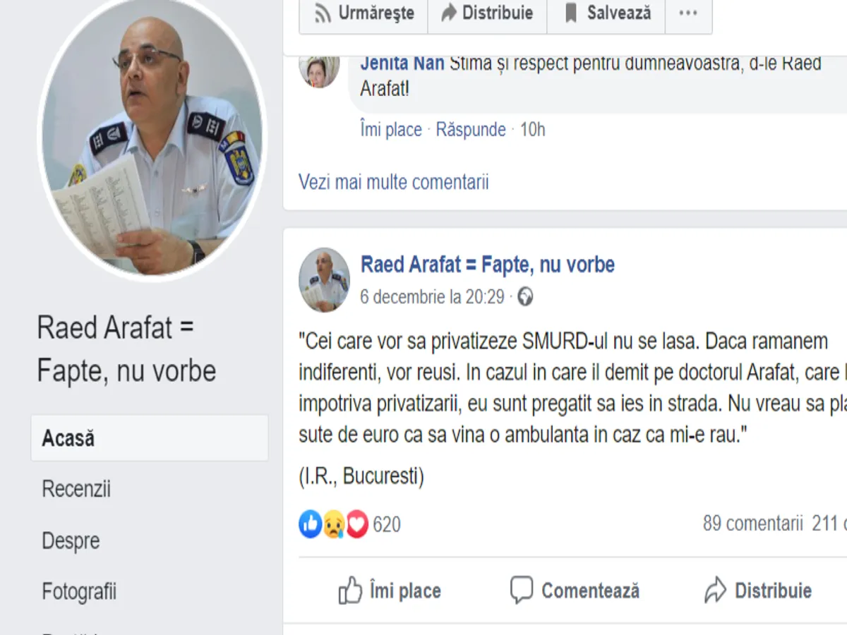 „Cei care vor sa privatizeze SMURD-ul nu se lasa. Daca ramanem indiferenti, vor reusi. In cazul in care il demit pe doctorul Arafat, care lupta impotriva privatizarii, eu sunt pregatit sa ies in strada. Nu vreau sa platesc sute de euro ca sa vina o ambulanta in caz ca mi-e rau.", arată o postare de pe pagina „Raed Arafat = Fapte, nu vorbe”.