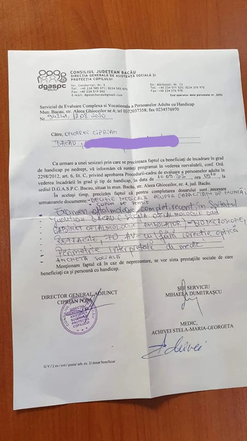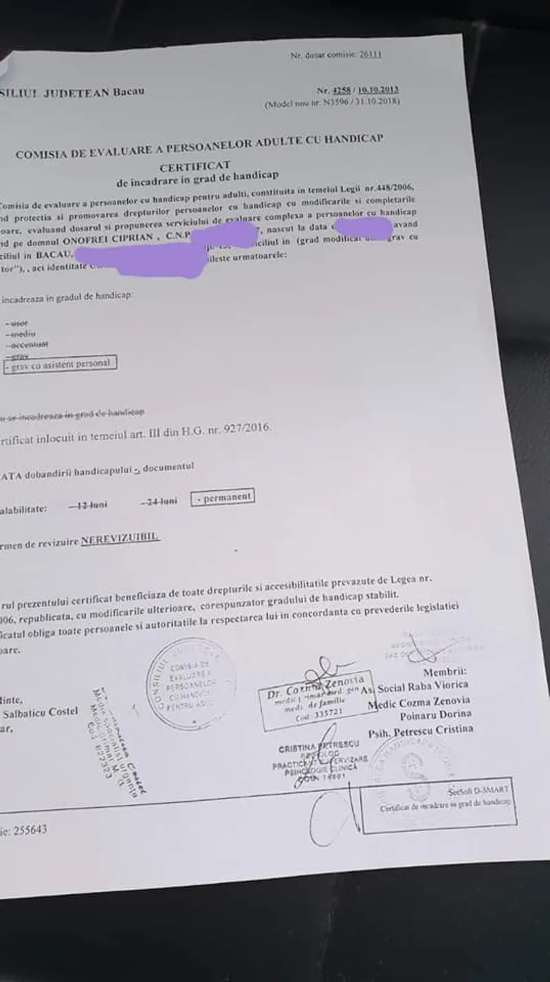 Nenorociții de la DGASPC Bacău uită intenționat faptul că aceasta instituție plină de imbecili i-au acordat certificat de încadrare în grad de handicap grav, cu însoțitor, PERMANENT, NEREVIZUIBIL, pe baza unor documente medicale care atestă, FĂRĂ DUBII, că bietul om, NU VEDE, document emis acum 7 ani, în 2013! (foto 2)