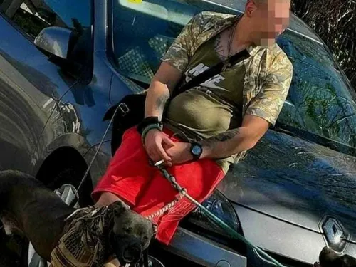 El avea substanţe interzise şi doi câini periculoşi, dintre care unul fără botniţă, astfel că a fost sancţionat şi dus la Poliţie.