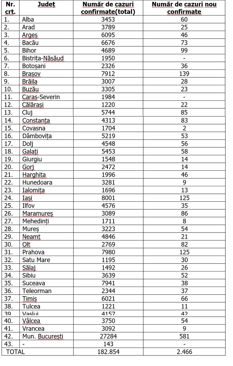 În total, în România au fost confirmate 182.854 de cazuri de infectare cu coronavirus, iar 5.931 de persoane infectate au murit, conform datelor de luni ale Grupului de Comunicare Strategică (GSC).