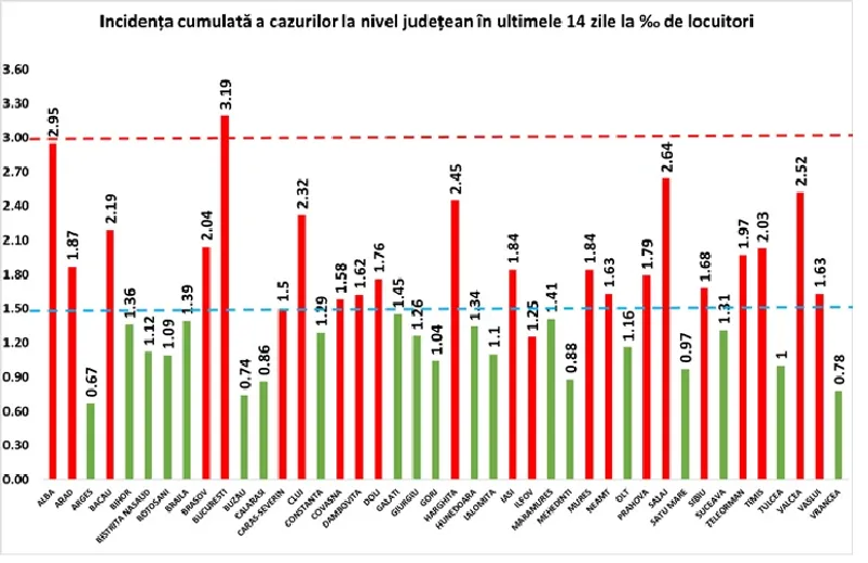 Coeficientul infectărilor cumulate la 14 zile, raportate la 1.000 de locuitori, calculat de către Direcțiile de Sănătate Publică, la nivelul Municipiului București și al județelor este următorul: