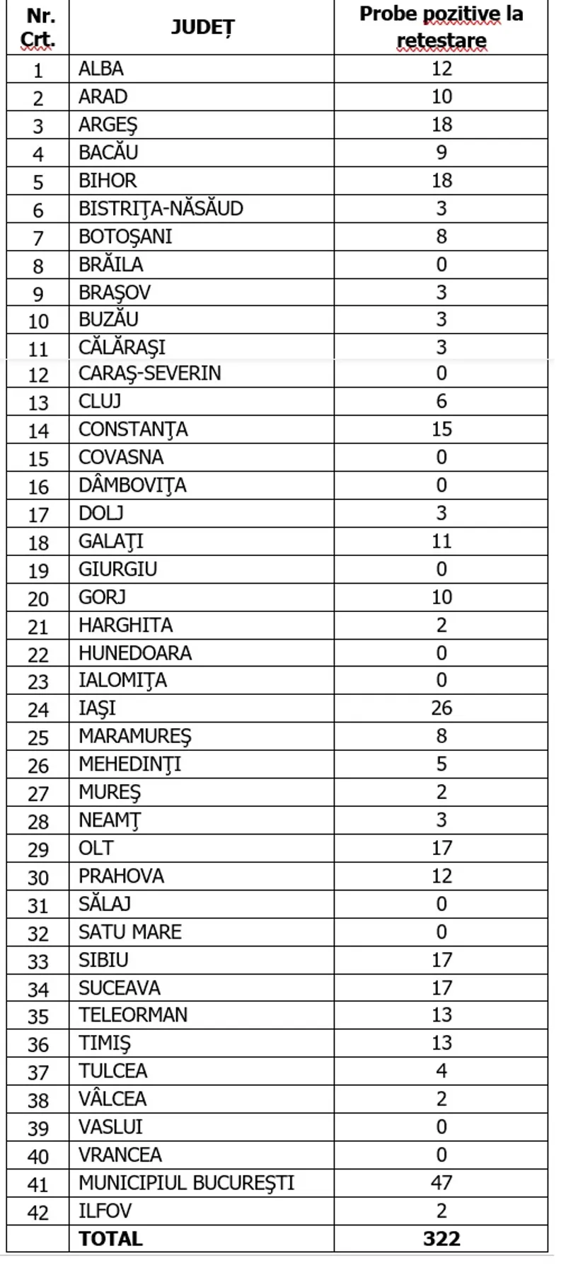 Distinct de cazurile nou confirmate, în urma retestării pacienților care erau deja pozitivi, 322 de persoane au fost reconfirmate pozitiv.