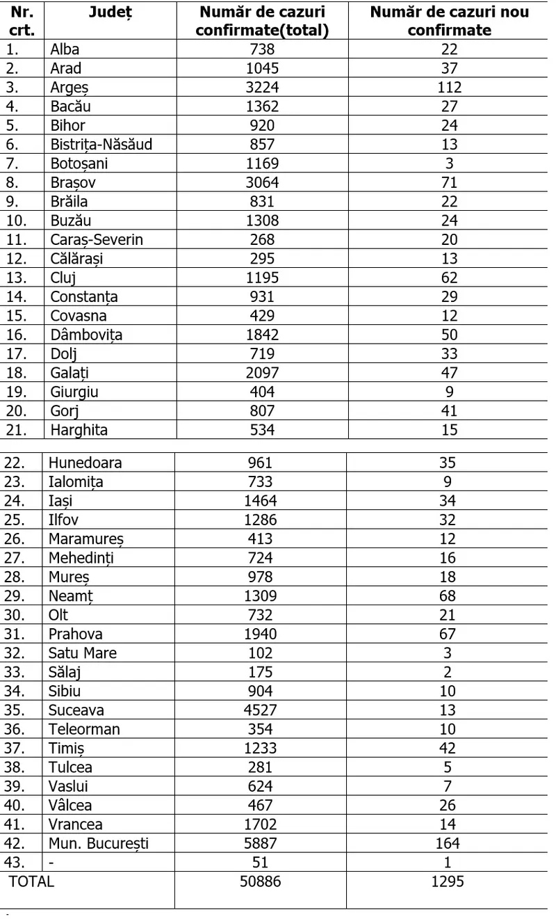 În total, au fost confirmate 50.886 de cazuri de persoane infectate cu coronavirus, dintre care: 27.007 pacienți au fost declarați vindecați și 4.433 pacienți asimptomatici au fost externați la 10 zile după depistare.