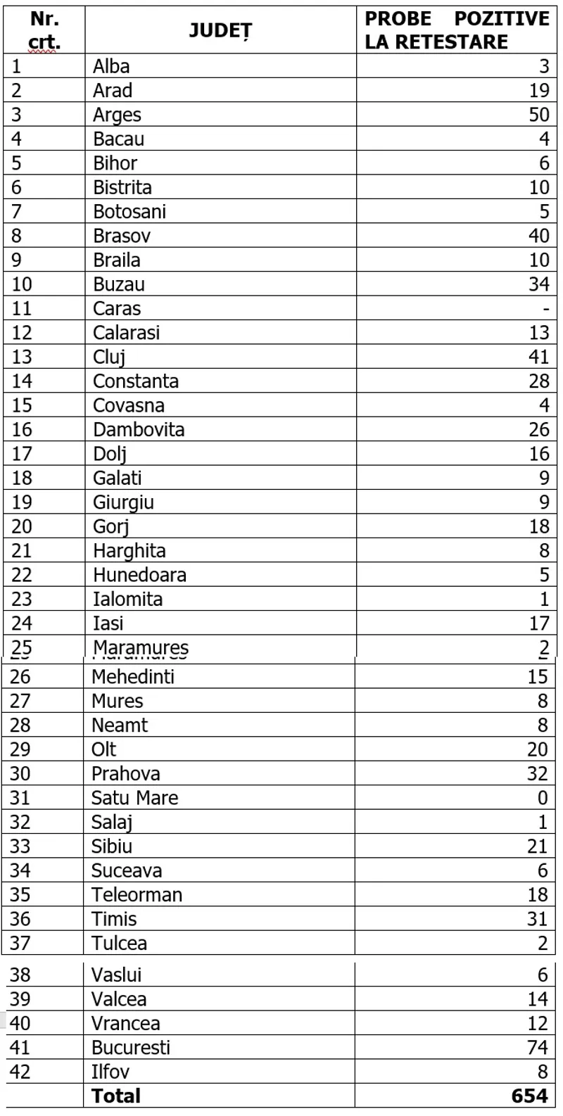 Distinct de cazurile nou confirmate, în urma retestării pacienților care erau deja pozitivi, 654 de persoane au fost reconfirmate pozitiv.