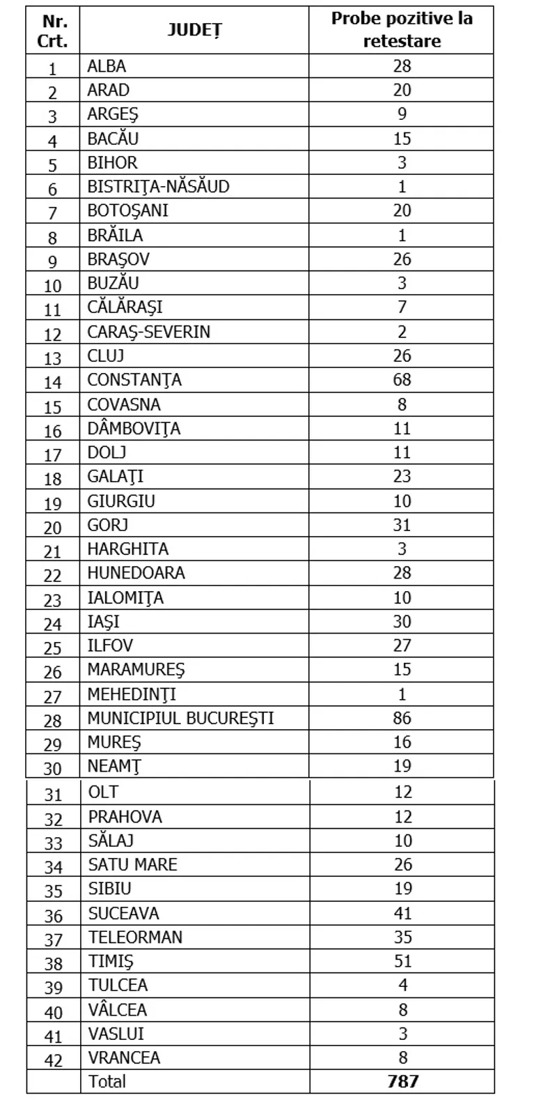 Distinct de cazurile nou confirmate, în urma retestării pacienților care erau deja pozitivi, 787 de persoane au fost reconfirmate pozitiv.