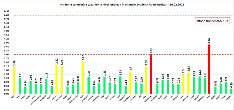 Județul Maramureș continuă să oscileze între scenariul roșu și cel galben, marți având o incidență de 3,01 la mia de locuitori. Județul Timiș raportează în continuare cea mai mare incidență din țară, 3,76 la mia de locuitori.