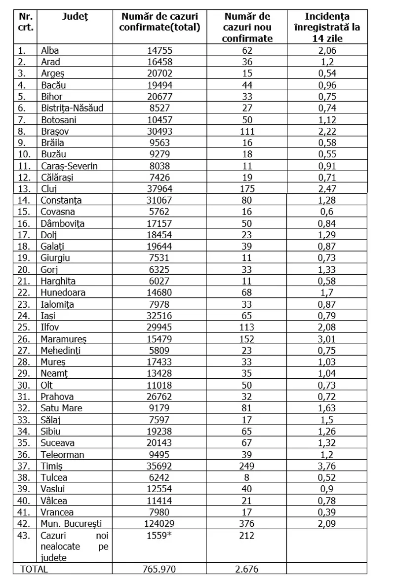 În total, în România au fost confirmate până în prezent 765.970 de cazuri de infectare cu coronavirus, iar 19.526 de oameni infectați au murit.