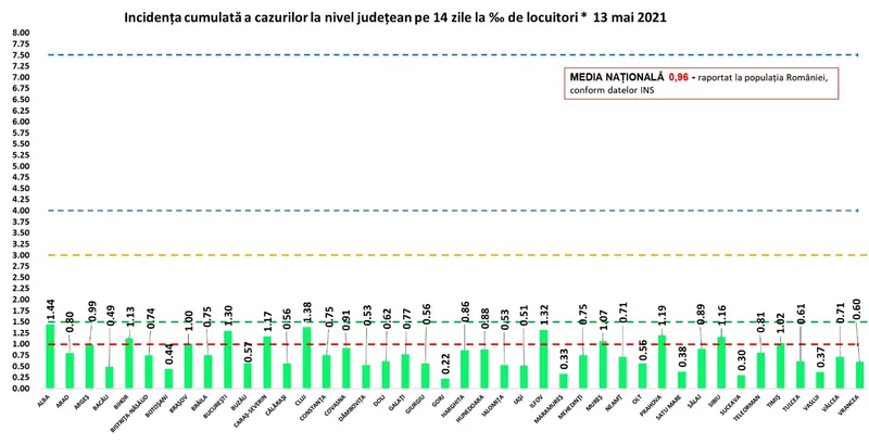 Coeficientul infectărilor cumulate la 14 zile, raportate la 1.000 de locuitori este calculat de către Direcțiile de Sănătate Publică, la nivelul Municipiului București și al județelor. Mai jos aveți graficul realizat în baza raportărilor primite de CNCCI de la Direcțiile de Sănătate Publică:
