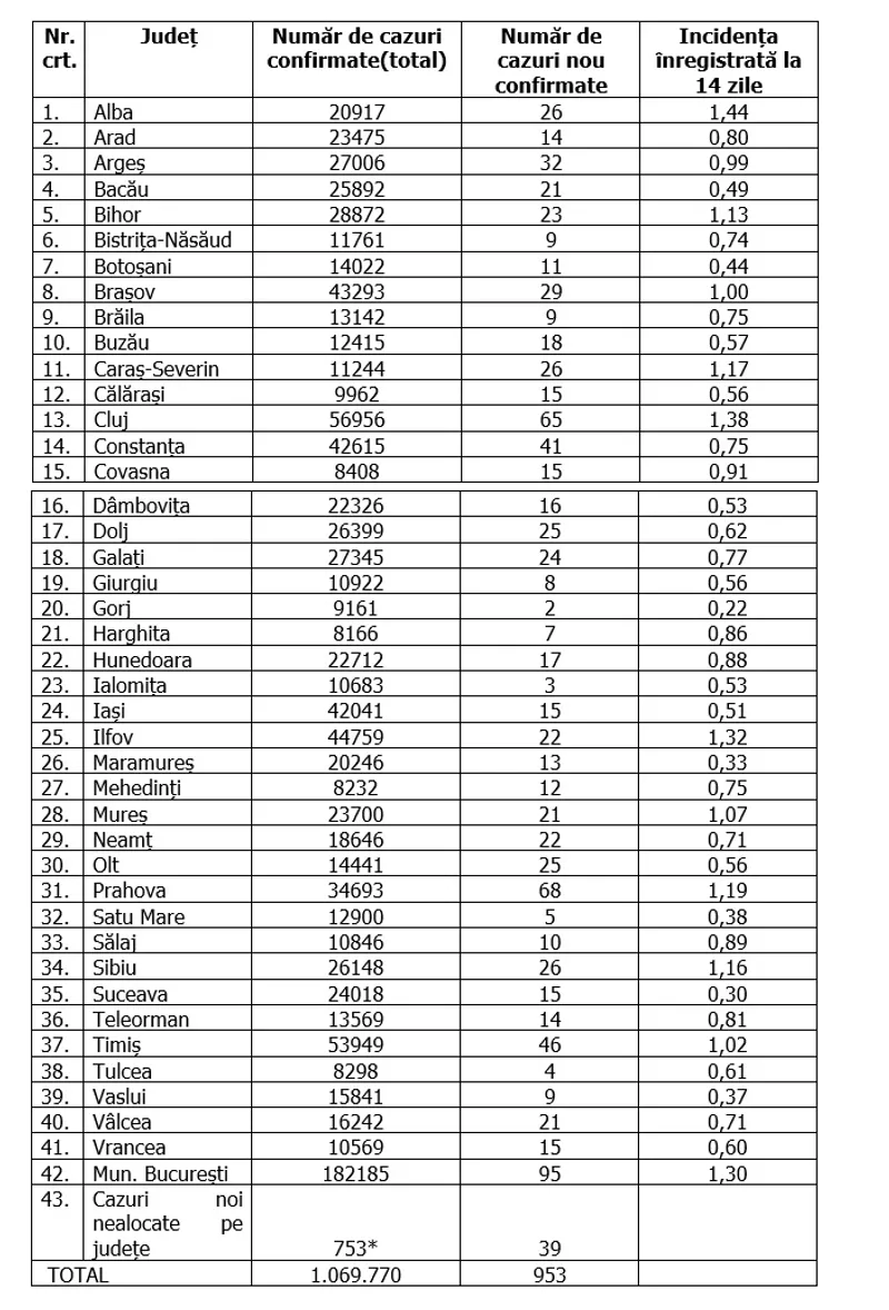 În urma testelor efectuate la nivel național, față de ultima raportare, au fost înregistrate 953 cazuri noi de persoane infectate cu SARS – CoV – 2 (COVID – 19), acestea fiind cazuri care nu au mai avut anterior un test pozitiv.