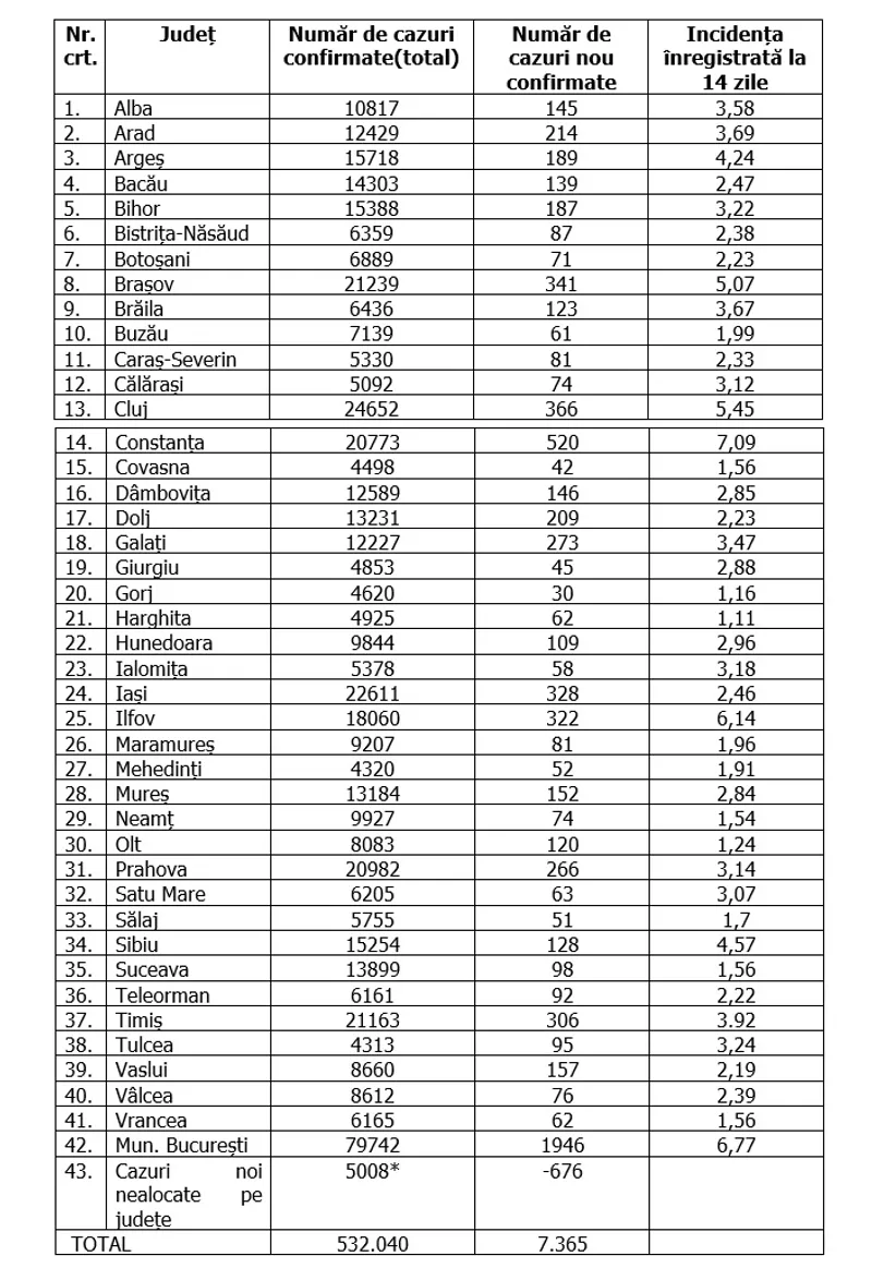 În total, în România au fost confirmate 532.040 de cazuri de infectare cu coronavirus, iar 12.821 de oameni au murit.