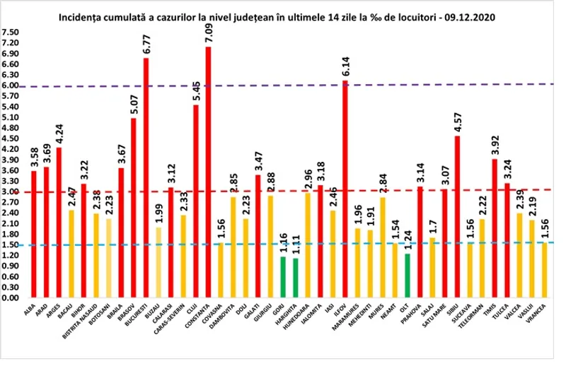 Coeficientul infectărilor cumulate la 14 zile, raportate la 1.000 de locuitori este calculat de către Direcțiile de Sănătate Publică, la nivelul Municipiului București și al județelor. Mai jos aveți graficul realizat în baza raportărilor primite de CNCCI de la Direcțiile de Sănătate Publică: