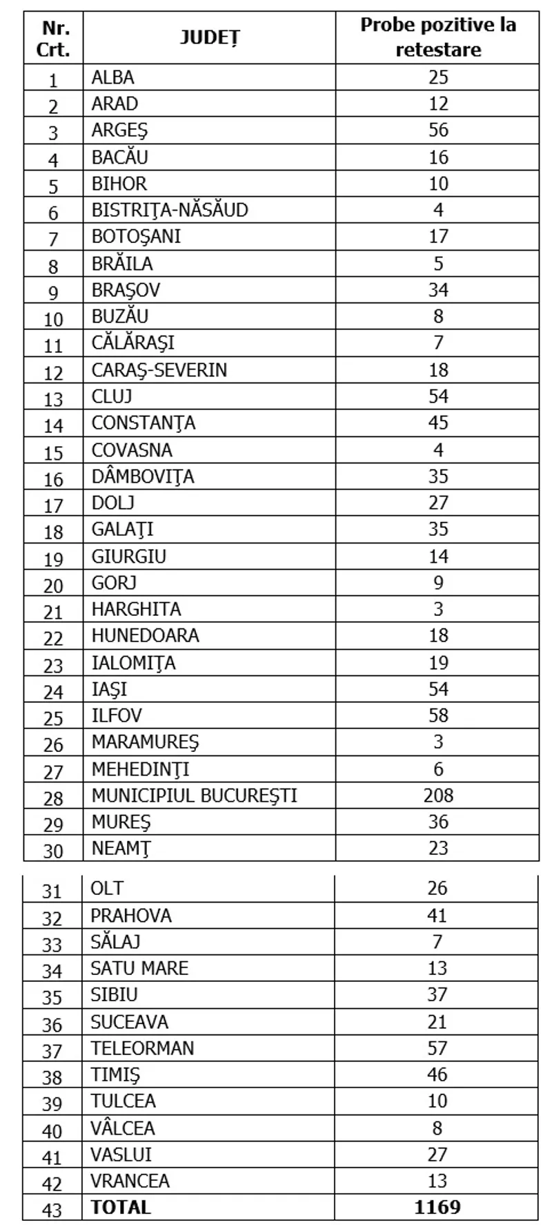 Distinct de cazurile nou confirmate, în urma retestării pacienților care erau deja pozitivi, 1.169 de persoane au fost reconfirmate pozitiv.