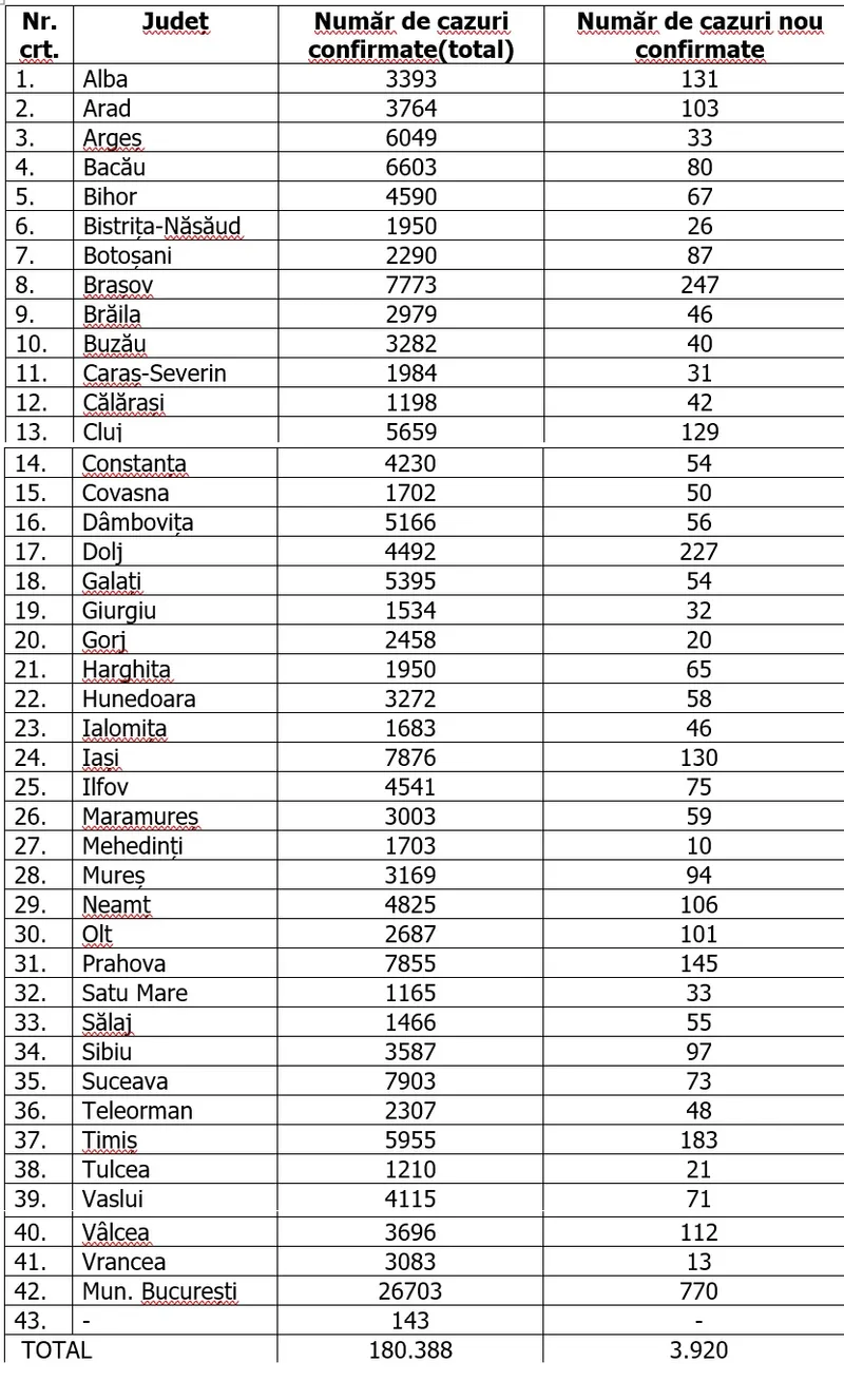 În urma testelor efectuate la nivel național, față de ultima raportare, au fost înregistrate 3.920 cazuri noi de persoane infectate cu SARS – CoV - 2 (COVID – 19), acestea fiind cazuri care nu au mai avut anterior un test pozitiv.