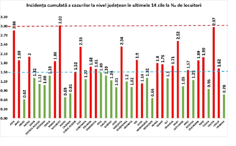 Coeficientul infectărilor cumulate la 14 zile, raportate la 1.000 de locuitori, calculat de către Direcțiile de Sănătate Publică, la nivelul Municipiului București și al județelor este următorul: