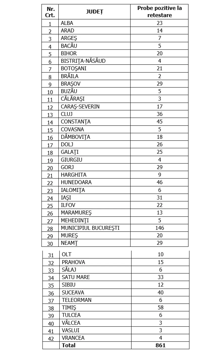 Distinct de cazurile nou confirmate, în urma retestării pacienților care erau deja pozitivi, 861 de persoane au fost reconfirmate pozitiv.