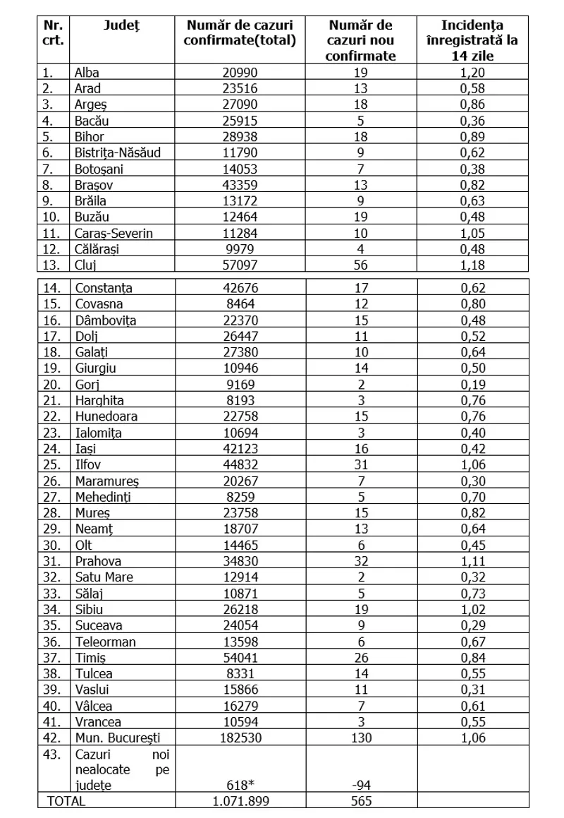 În total, în România au fost confirmate 1.071.899 de cazuri de infectare cu coronavirus, iar 29.523 de oameni infectați au murit.