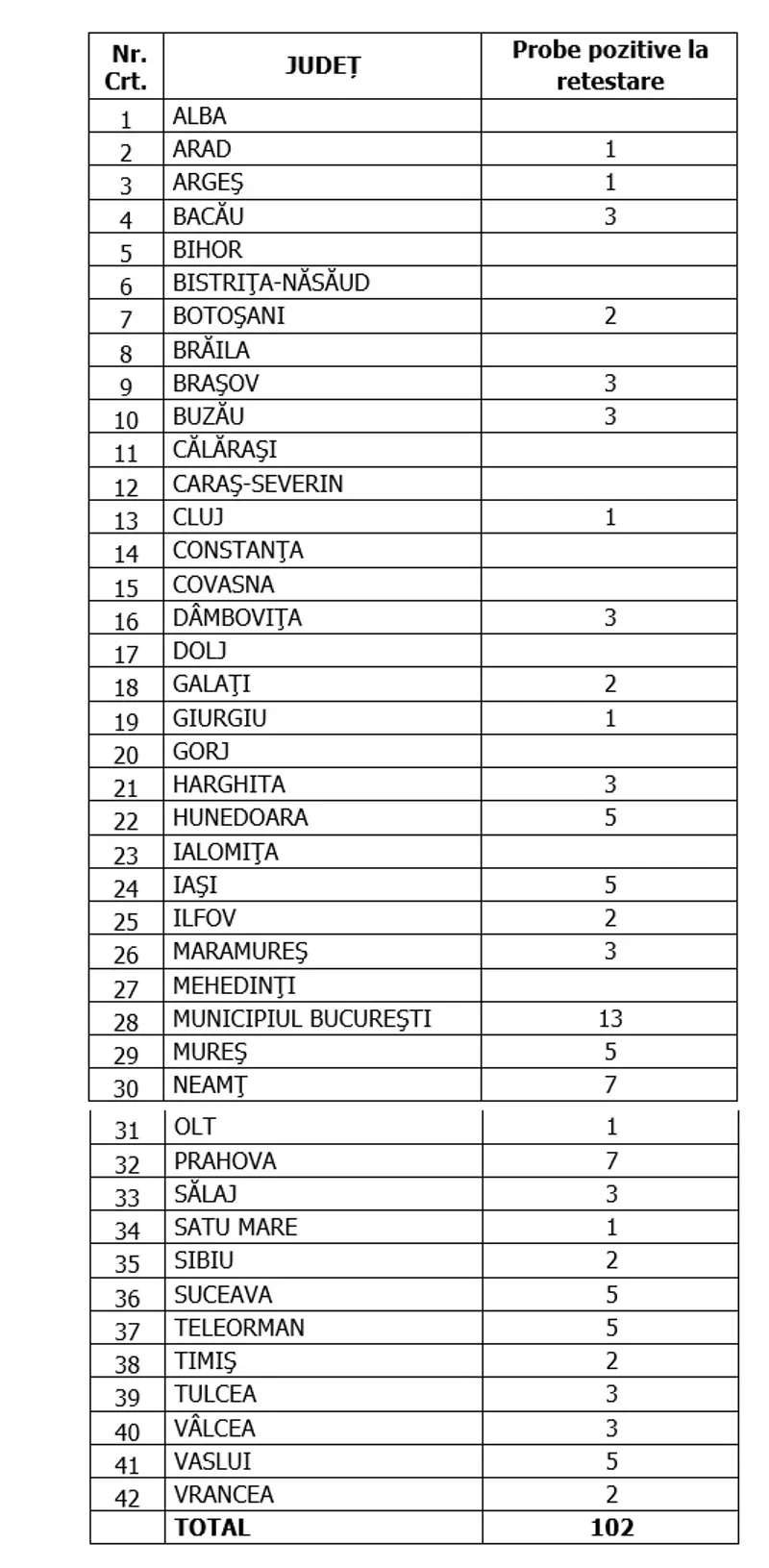 Distinct de cazurile nou confirmate, în urma retestării pacienților care erau deja pozitivi, 102 persoane au fost reconfirmate pozitiv.
