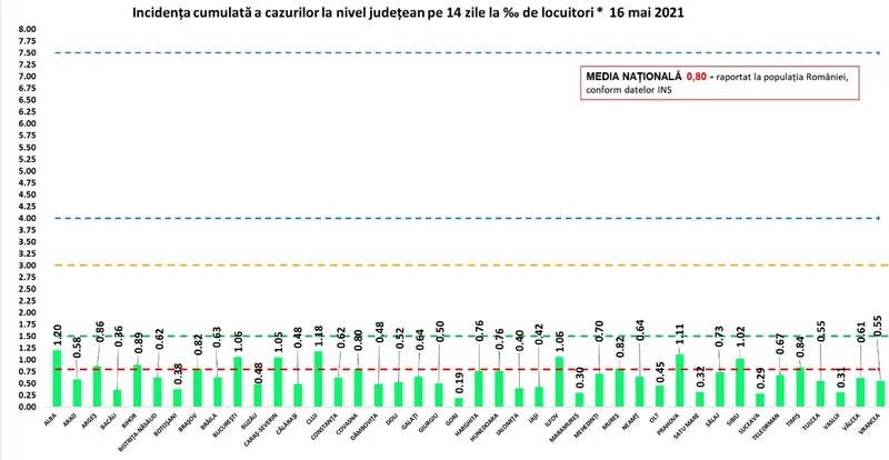 Coeficientul infectărilor cumulate la 14 zile, raportate la 1.000 de locuitori este calculat de către Direcțiile de Sănătate Publică, la nivelul Municipiului București și al județelor. Mai jos aveți graficul realizat în baza raportărilor primite de CNCCI de la Direcțiile de Sănătate Publică: