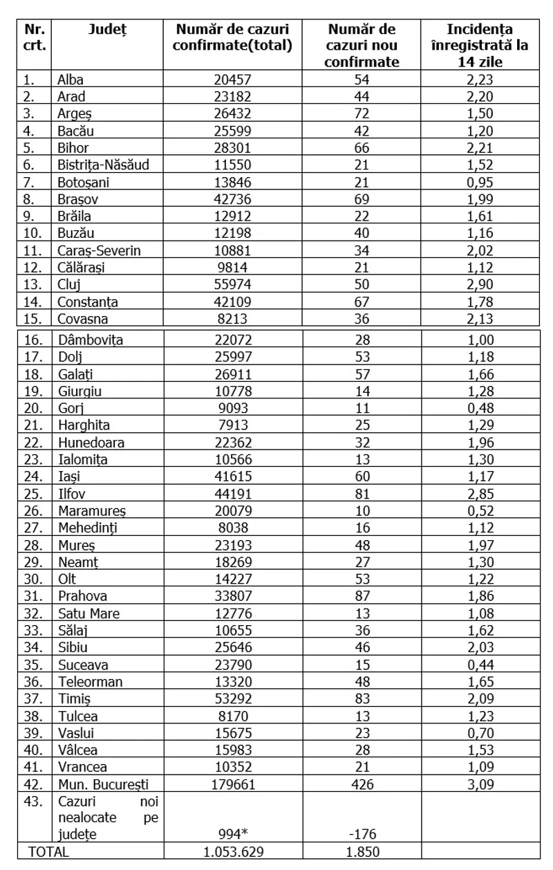 În total, în România au fost confirmate 1.062.527 de cazuri de infectare cu coronavirus, iar 28.710 de oameni infectați au murit.