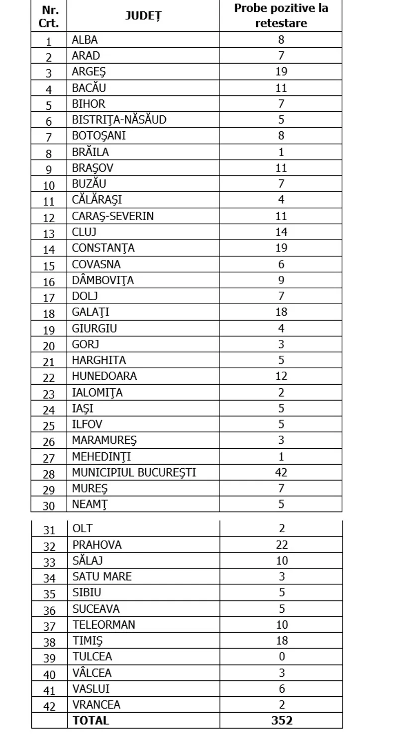 Distinct de cazurile nou confirmate, în urma retestării pacienților care erau deja pozitivi, 352 de persoane au fost reconfirmate pozitiv.