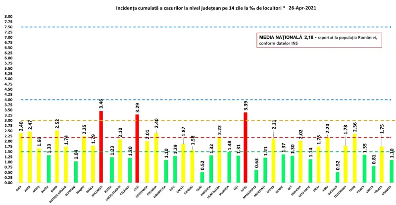 Coeficientul infectărilor cumulate la 14 zile, raportate la 1.000 de locuitori este calculat de către Direcțiile de Sănătate Publică, la nivelul Municipiului București și al județelor. Mai jos aveți graficul realizat în baza raportărilor primite de CNCCI de la Direcțiile de Sănătate Publică:
